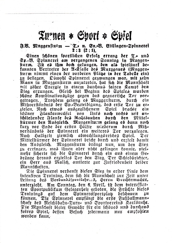 Dieser älteste vorliegende Spielbericht stammt wohl aus dem Jahre 1930. Die Spinnerei Elf spielte damals in der A-Klasse, Gau Karlsruhe, Bezirk II. Der Gegner F.V. Muggensturm startete ebenfalls in der A-Klasse, jedoch in der sogenannten Südbaden Gruppe III. Die A-Klasse war damals die dritthöchste Spielklasse. Die drei Staffeln des Gau Karlsruhe (genannt A-Klasse des 1., 2. bzw. 3. Bezirk) bildeten den Unterbau der Kreisliga Mittelbaden. Diese bildete zusammen mit den Kreisligen Südbaden, Oberbaden und Schwarzwald wiederum den Unterbau der Bezirksliga Baden. Im Gau Karlsruhe gab es zudem die B-Klasse unterhalb der A-Klasse (wahrscheinlich 4 Staffeln).